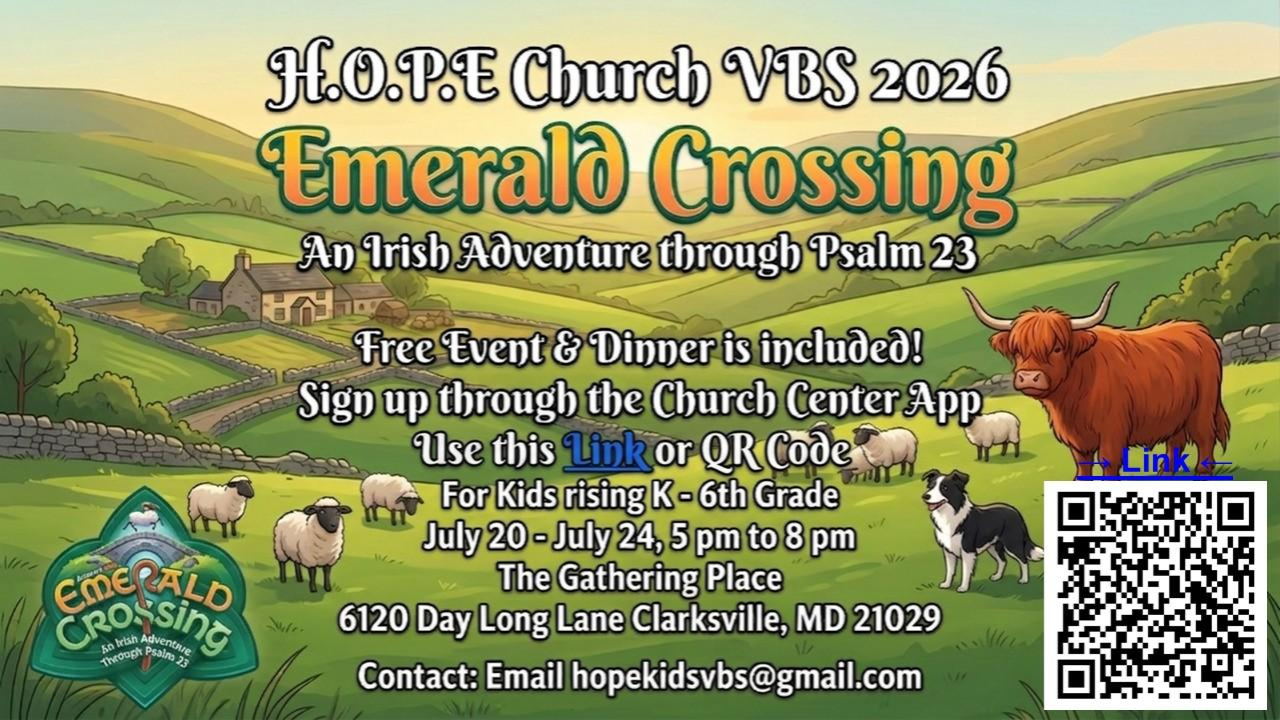 The H.O.P.E Church's VBS 2026: Emerald Crossing Registration is now OPEN! Sign up through the Church Center App using the LINK or QR Code.